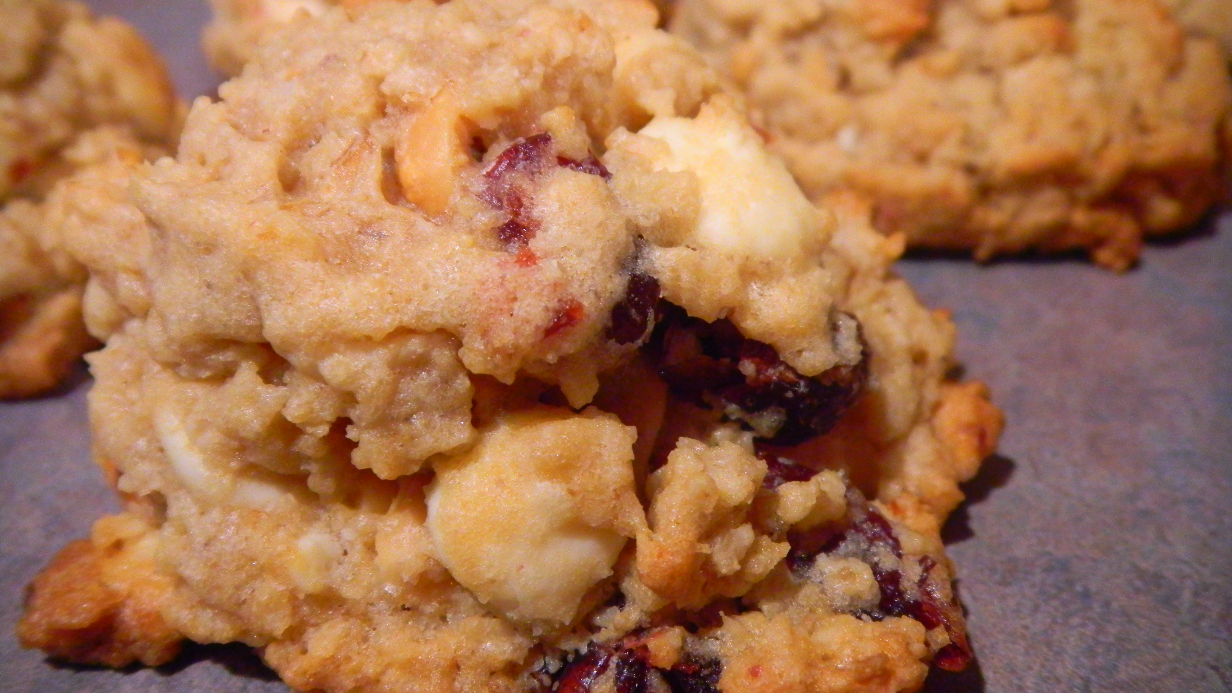 When you think “oatmeal cookies”, you are either reminded of days of yore with “over the river and through the woods” to grandmas cookies, OR you think of the sad excuse for oatmeal cookies that are made by “Little Debbie”. (Don’t get me wrong, I love Little Debbie. She has a special place in my artery clogged heart.) My cookies are not like either. They are big and moist and full of white chocolate, cranberries, and peanuts.