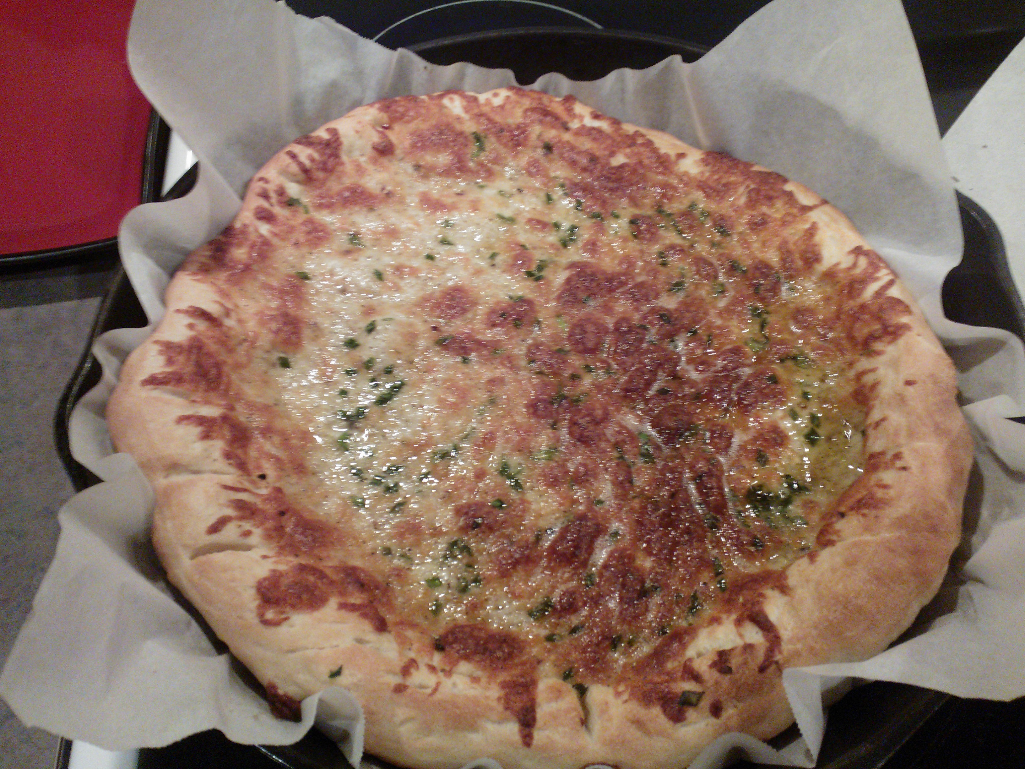 I also made cheesy bread sticks this time around. I started with the same dough, but then I melted a stick of butter, grated two cloves of garlic, added 2 cups of grated cheese, Italian seasoning, chives, salt and pepper. I baked it for 15 minutes. Magical things happened in that time in the oven. It was cheesy, and garlicy, and AMAZING. I died a little bit when I ate the first slice. I died a little bit when I ate the next 4 pieces as well.
